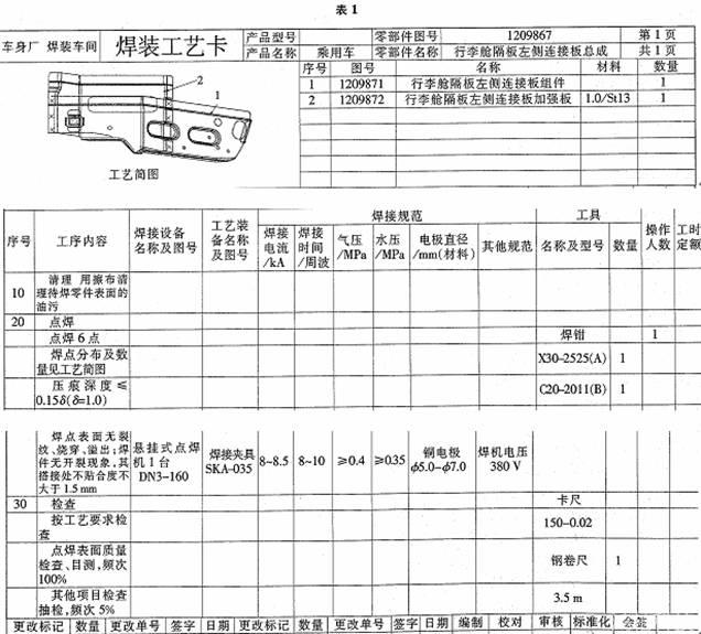 焊點分組工作完成后即可進行焊鉗選型,確定焊點組的數量即焊鉗的最小數量,根據工件的形狀及尺寸確定焊鉗的形式(X形,C形)及喉深、開檔、行程、電極形狀,焊鉗的吊掛形式(橫吊、縱吊、轉環)根據焊點位置和操作位置確定。焊鉗型號的確定要在夾具總圖設計完成之后,根據選定的焊鉗制造商提供的型譜進行焊鉗型號的選擇,對于在型譜中找不到合適焊鉗焊接的焊點,需要重新設計焊鉗與之匹配。2.2編制工藝過程卡