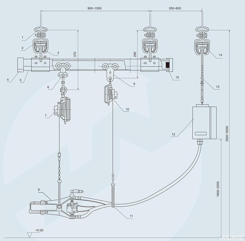 表示焊鉗、平衡器的型號(hào)、數(shù)量、安裝位置、吊掛方式,供焊鉗安裝使用。簡(jiǎn)單的裝焊線可直接在車間工藝平面圖中表示。