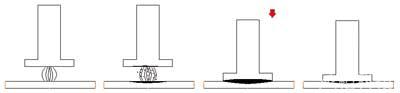 接觸式螺柱焊依靠焊槍內(nèi)置彈簧壓緊螺柱,工件和螺柱之間的距離由螺柱頂部小凸臺來保證,當(dāng)電容放電時(shí),小凸臺迅速氣化,螺柱和工件之間出現(xiàn)電弧,電弧產(chǎn)生的熱量使螺柱頂部形成熔化層,工件表面形成很淺的熔池。在焊槍內(nèi)置彈簧壓力下,螺柱快速下沉,在3~4ms內(nèi),螺柱浸入熔池,電弧消失,熔池冷卻迅速形成焊接接頭。