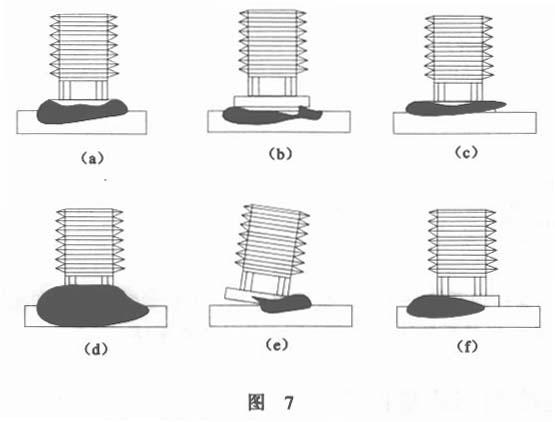 圖7e所示表明螺柱傾斜,只有局部的焊縫。通過矯正焊槍位置,使其與焊接表面垂直即可解決。