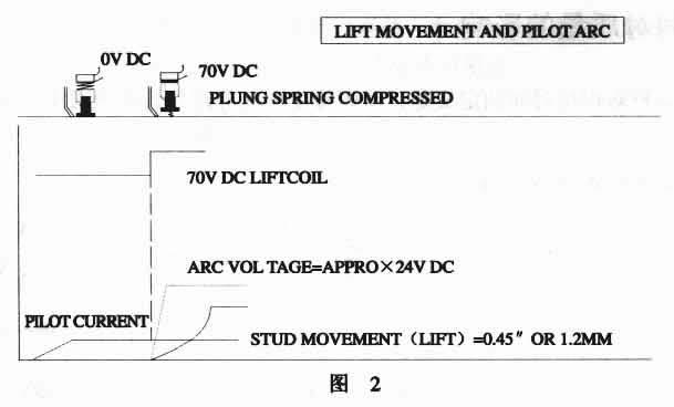 緊接著焊槍中的提升線圈得到70V(DC)的電壓,線圈動作,將螺柱提升到(0.45″1.2mm),已被激活的金屬表面在電壓作用下由此而產生拉弧,由于提升高度一定,電弧電壓最終約為24V(DC)。該電壓為維弧電壓,為主電弧的順利導入創造了條件,如圖2所示。