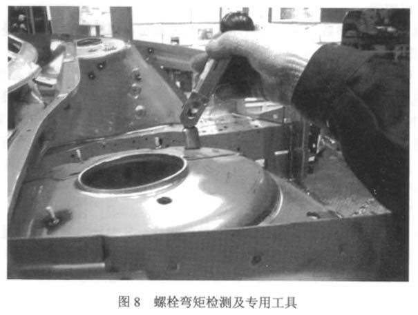 ⑵彎矩檢測 上海通用汽車采用專用的測力工具對`螺柱進行檢測。該專用工具如圖8所示,在檢測螺柱前,先按不同螺柱的尺寸調整好工具,檢測時手柄擺動角度為50°,如果螺柱在檢測時無斷裂和焊縫開裂,該螺柱為合格。