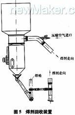 該裝置(如圖5)安裝有小車上;以壓縮空氣為動力,使回收的焊劑在節流帽中高速度旋轉,在出氣方向粒度較小的焊劑和粉末被吸附,提高了回收焊劑的質量,改善了工作環境,減少浪費,減輕了勞動強度。