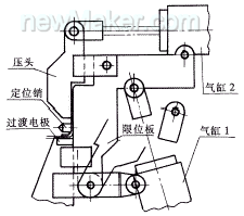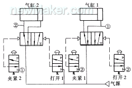 首先,根據產品結構,在氣缸1推出時,氣缸2必須處于縮入狀態,否則側板無法裝入。施焊完成后,在氣缸1縮入時,氣缸2也必須首先處于縮入狀態,否則,就會將焊好的總成件拉壞。由此可知,在設計氣路圖時必須保證: