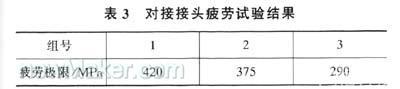 試驗結果見表3。由表3可知MAG焊后,焊縫磨平的情況,疲勞極限最高,接近Q345(16Mn)鋼的屈服點(σs=430MPa),而且都斷于母材;MAG焊后焊趾TIG重熔的情況,疲勞極限稍低,疲勞裂紋都起始于TIG重熔焊縫的焊趾處;MAG焊后不作任何處理的焊縫疲勞極限最低,疲勞裂紋都起始于焊趾處。