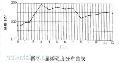 (2)顯微硬度試驗 結果見圖2。由圖可知,TIG重熔焊道及其熱影響區的硬度較母材及焊縫處的硬度要高。這主要是由于Q345(16Mn)鋼有一定的淬硬性造成的。