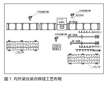 合梁工序主要承擔縱梁總成透孔前內梁及外梁槽鋼合梁任務,生產線可實現自動化生產,由送料小車、磁力上料裝置、橫向鏈式進料道、翻轉機構、輔助工作臺、縱向送料滾道、點焊機主機、磁力下料裝置、出料小車及料架等組成,各部分通過控制系統有序進行動作。