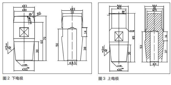 由于內外梁為不等厚度的低碳鋼板,通常情況下,不同厚度不同材料焊接時,形成熔核不以貼合面對稱,而向厚板或者導電導熱性差的焊件偏移,厚度相差越多,現象越明顯,結果貼合面尺寸小于該熔核直徑,使得焊接強度降低。因此,當焊接內外梁厚度差距較大縱梁時,電極設計應當采用不同形狀上、下焊極焊接,與厚板外梁接觸下電極應當相對增大焊極端面,同時增大下電極冷卻水腔直徑,使得下電極散熱增強,而上電極相對焊接端面及冷卻水腔較小,溫度場向外梁一側偏移,使得貼合面熔核直徑增加,焊接強度相應提升。另外,可適當增加上電極有效焊接長度,以提高焊極使用壽命,焊接不同厚度組合內外梁時電極選擇如表1所示,電極1、2分別如圖2、圖3所示。