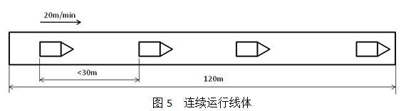 在線體內的兩車間隔方面,例如圖5所示的連續運行的線體,若運行速度為20m/min、線體全長為120m且節拍為40JPH,在不考慮設備開動率、車身長度等因素的情況下,兩臺車的出車間隔為90s,即兩臺車之間的距離必須小于30m。