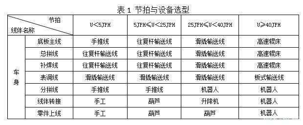 設備選用的考慮因素通常包括生產節拍、采購成本和設備柔性化可擴展能力。根據目前上汽工廠的規劃實際,常用機運形式的節拍與設備選型通常遵照表1。