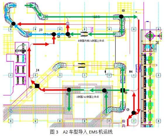 在上汽車身車間A2車型導入的過程中,為了兼顧多種車型的生產配比,我們對整個側圍EMS輸送線進行了柔性化設計,如圖3所示,其中綠色為A、B和Z車型的老線路,紅色為新增的A、A2和B車型線路,藍色的為A和A2車型共用線路。在確保高節拍的B車型和A車型的正常輸送外,在低節拍的Z車型側圍處增加了A2車型的側圍輸送線,共線后的側圍機運線將可以實現B、A、Z和A2四種車型的柔性化,具備無級切換輸送能力,同時確保A車型和A2車型能同時以高節拍生產。
