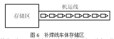 在停線后的緩存數量方面,設備停機會直接影響出口處的出車,緩存區域的車體數量為線體停線后可以連續出車的時間。例如圖6所示的補焊線車體存儲區,機運線節拍為40JPH,要求停線后能夠保證機運線連續出車30min,需要的存儲數量為20臺車。