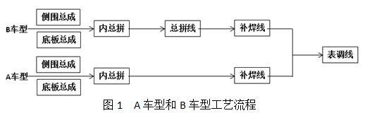 上汽某車身車間共線生產A和B兩種車型,B車型側圍分為側圍外板和內板,需要在拼合側圍和車頂板后才能拼合側圍外板,因此B車型需要有內總拼和總拼兩次總拼;而A車型側圍內板和外板可在側圍分拼完成拼合,因此完成內總拼后可直接進行補焊。兩種車型的工藝流程如圖1所示。